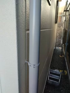 雨樋や水切りなどの金属部はケレンと錆止めのうえで上塗りし、全体の色味と艶をそろえて仕上げています。